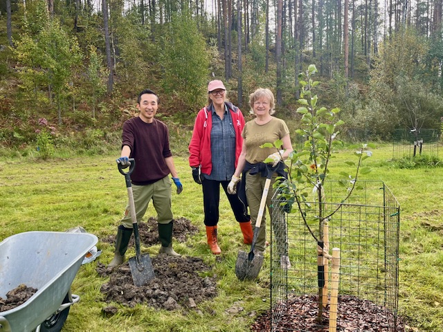Ett äppelträd planterades på ängen. Målning vid servicehuset